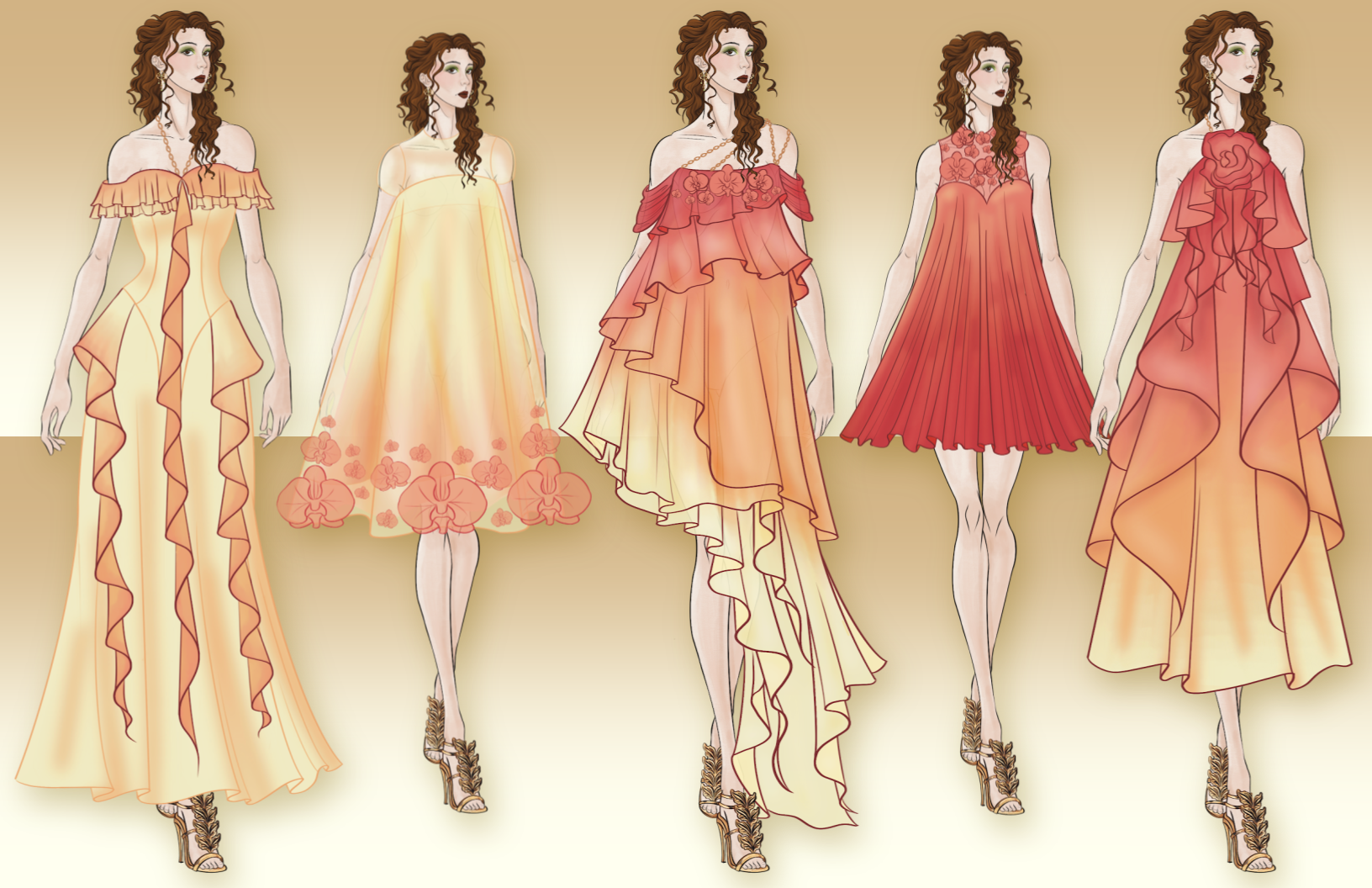 Aesthetic Preference: Fluid lines, Asymmetrical hems, nature inspired embroidery/beading. Pastels, Antique Golds, Soft Jewel Tones, Iridescent Shades. Silk, Chiffon, Organza. Historical influence blended into modern design